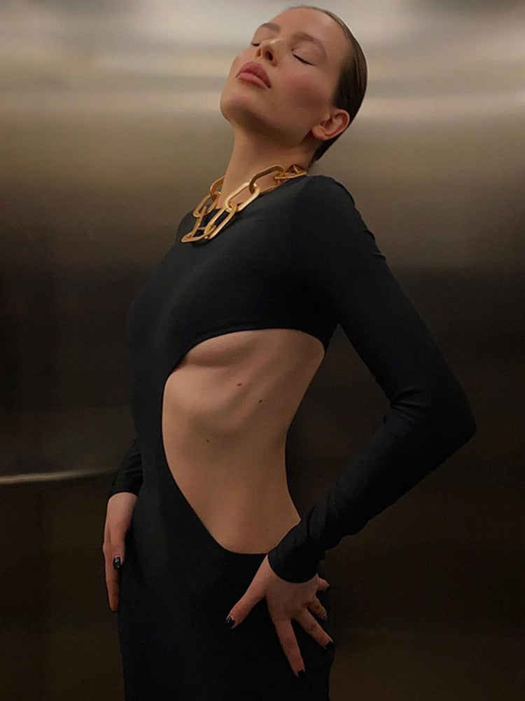Cryptographic Sexy Black Cut Out Round Neck Long Dress Women Elegant Long Sleeve Club Party 2022 Spring Dresses Skinny Clothes